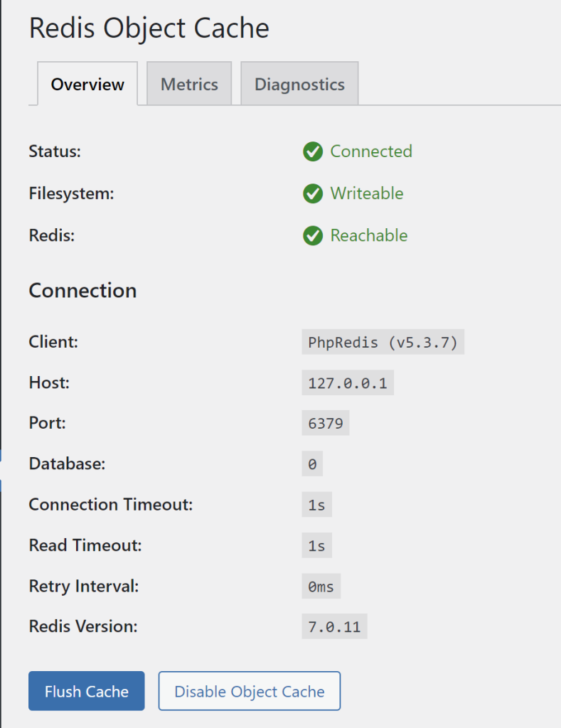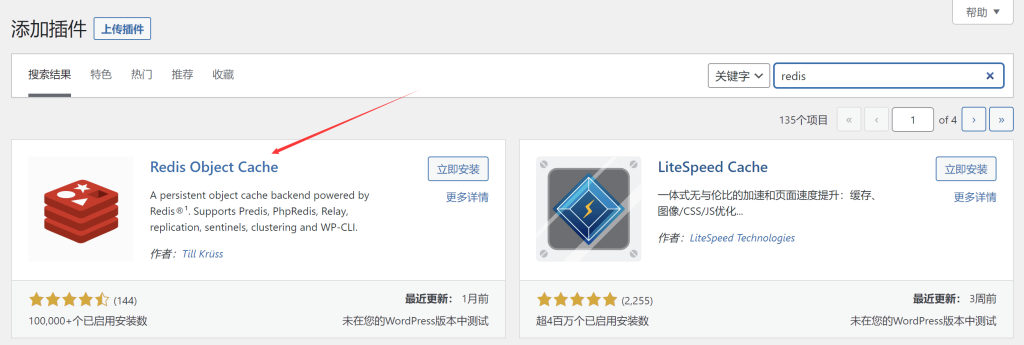 然后在WordPress后台搜索插件 Redis Object Cache 安装