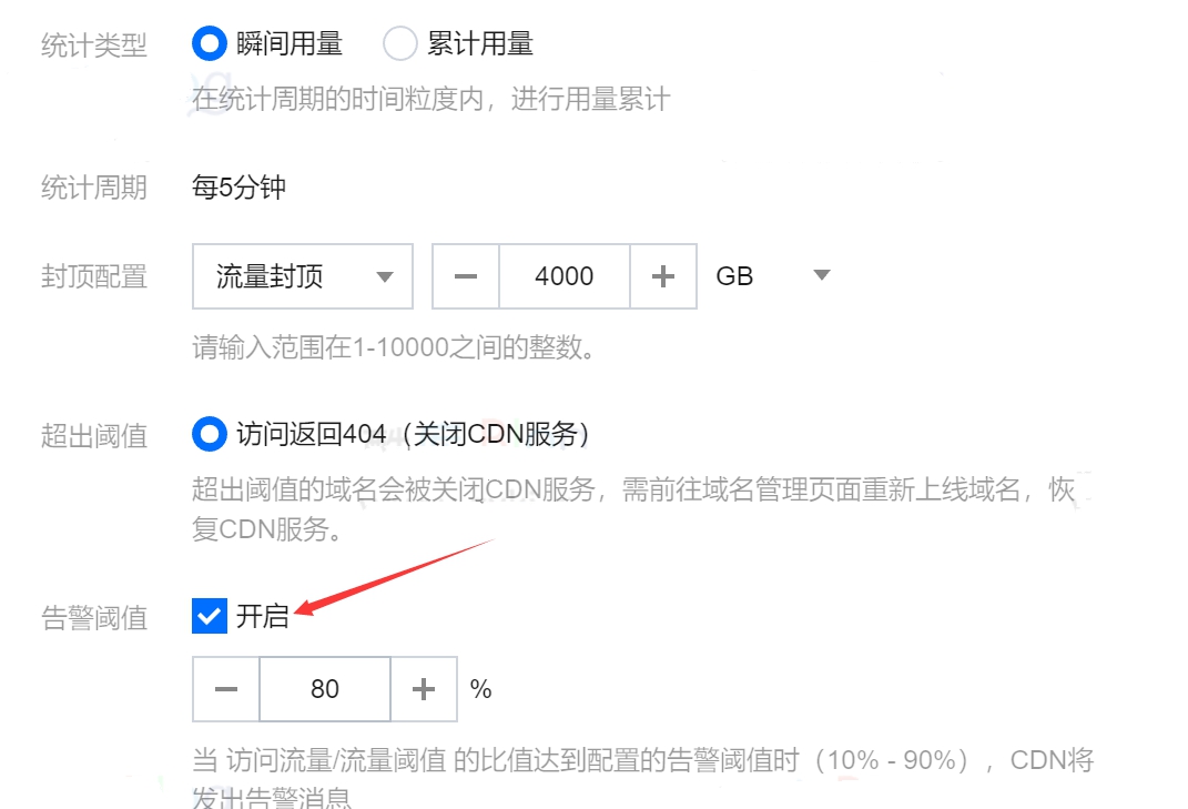 这里分为瞬间用量和累计用量,设置阈值后超出阈值的域名会被关闭CDN服务,可以防止产生高额订单。